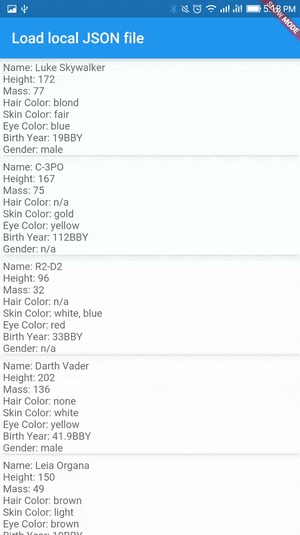 Example app showing implementation which loads up a json file from a local folder.